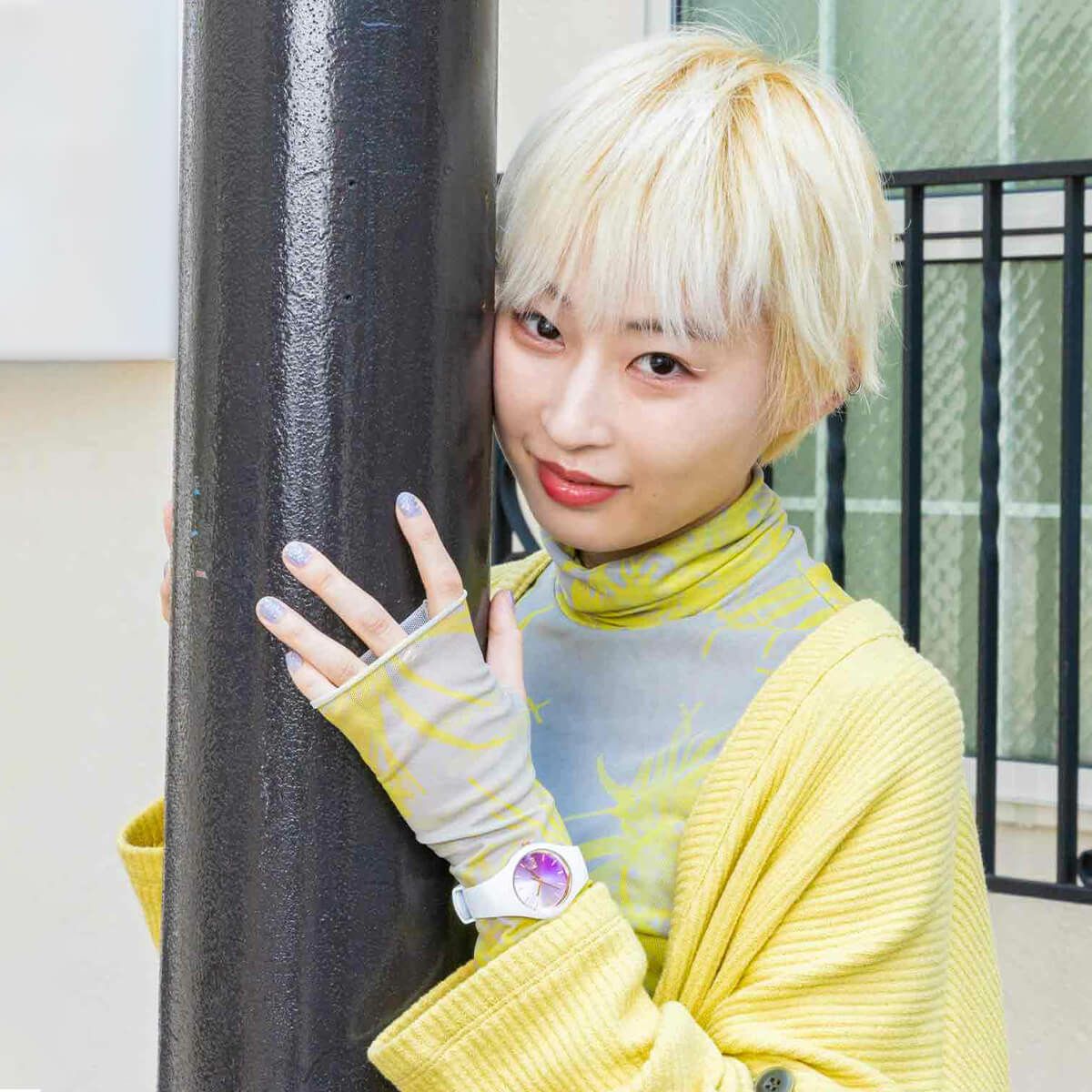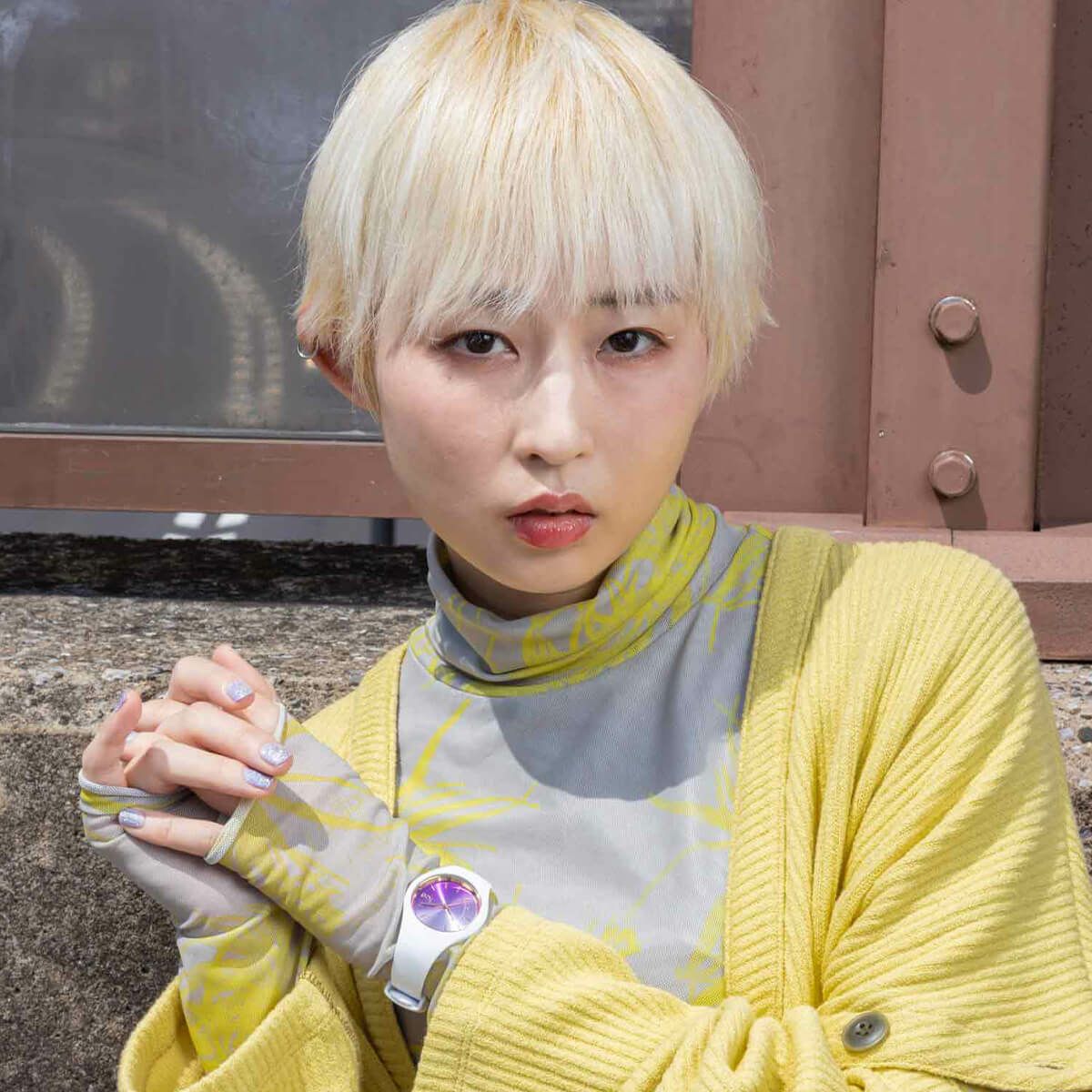 新ビジュアルは、 PORIN(Awesome City Club)がイエロー&ホワイトをベースにまとめた爽やかなコーディネートで登場。アイス サンセットの「オーキッド」を着用し、コーディネートと反対色になるパープルのアクセントカラーが際立つ遊び心のあるスタイルを表現しています。色鮮やかな配色は1本で主役級の存在感を放ち、腕元を明るく演出する。