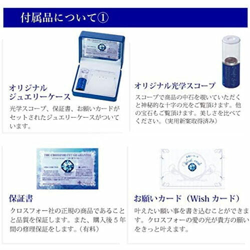 クロスフォーカットとは、3年間の歳月をかけて研究開発を繰り返し、光のリフレクション効果で宝石の中に十字の輝きをもたせたカットです。そのクロスの輝きは、付属の専用スコープでご覧いただけます。