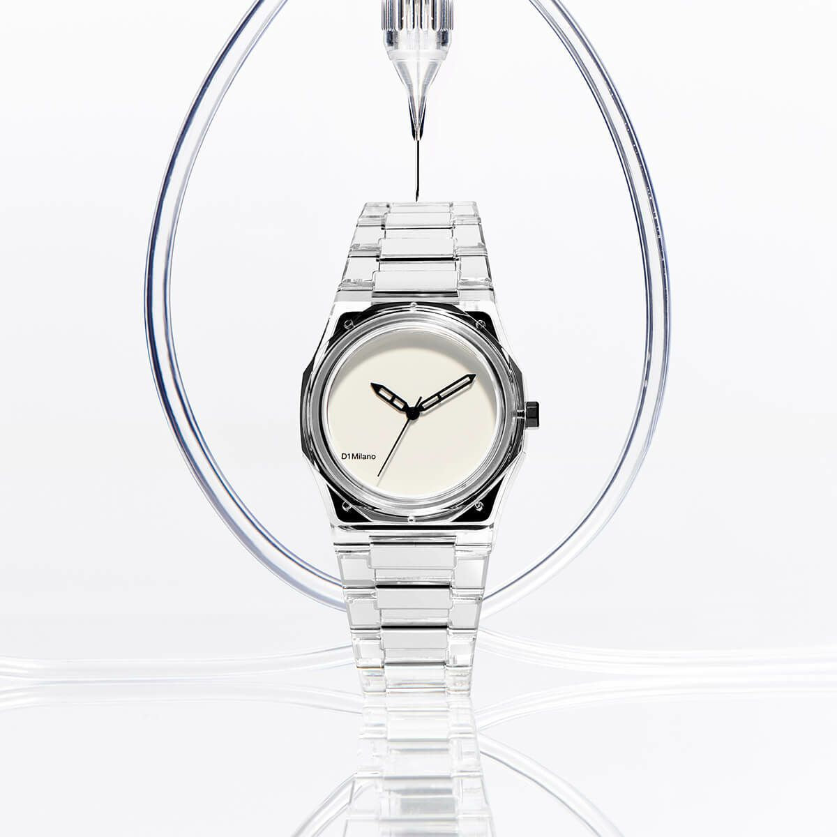 透明感溢れるナイロン素材を採用し、これまでにない軽やかさと視覚的な美しさを両立したコレクション。純粋な色彩が際立つ文字盤と、研磨されたスケルトンハンドの絶妙なコントラストが、ミニマルでありながらも大胆なデザインを実現している。シンプルながらも視線を引き付ける39mmのユニセックスサイズは、どんなスタイルにも合わせやすく、軽やかなスタイルを楽しむことができる。ブラックとホワイトの2色展開。