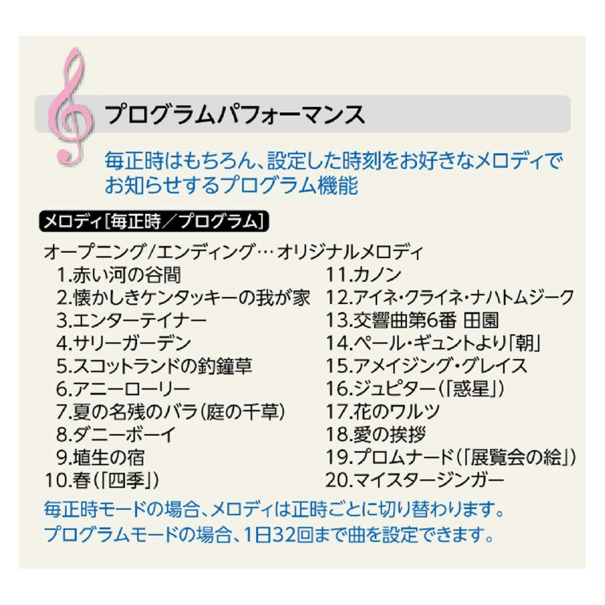毎正時はもちろん、あなただけの特別な時間や記念日をお好きなメロディでお知らせするプログラム機能をプラス!