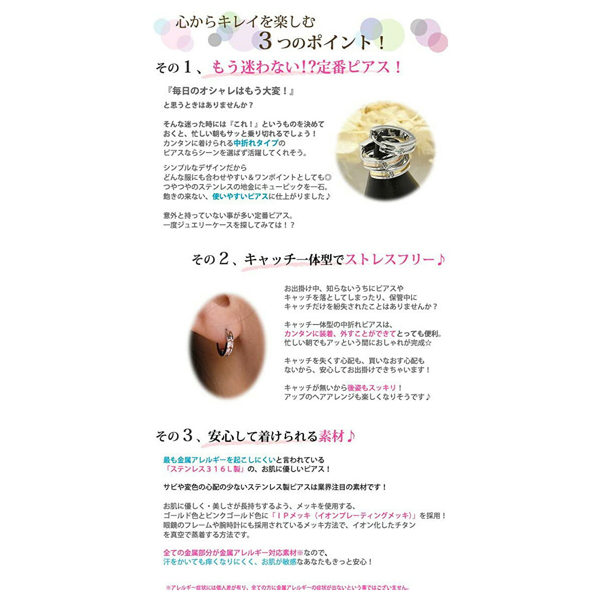 [Negozietto] ネゴツィエット ピアス W1S15-MQ101PG < 低金属アレルギー ステンレス 316L フープ 中折れ 1.5mm CZ付 3mm×13.5mm ピンクゴールド >